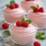 This dessert is best served cold and doesn’t require reheating. Let it remain chilled to preserve the perfect mousse consistency and fresh raspberry flavor. If the mousse has softened too much, simply give it a gentle stir and chill again briefly before serving.