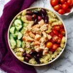 Start by cooking the pasta according to the package instructions until it’s perfectly al dente. Once drained, rinse it under cold water to immediately stop the cooking process and cool it down, which helps keep the bodies of the salad crisp and not mushy.