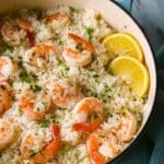 When the shrimp are cooked through and your rice is fluffy and soak up all the delicious juices, remove the skillet from heat. Drizzle the juice of half a lemon over the dish for a vibrant pop of freshness that cuts through the richness. Top off with a sprinkle of chopped parsley to add a bright, herbaceous touch and a gorgeous burst of green color that makes the dish as beautiful as it tastes.