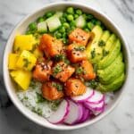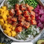 Spicy Salmon Bowls with Coconut Rice combine tender roasted salmon glazed with a zesty coconut milk dressing, served over fragrant coconut rice and topped with fresh mango, cucumber, avocado, edamame, and vibrant garnishes. This colorful, flavorful dish offers a perfect balance of spicy, sweet, and tangy flavors, ideal for a nutritious and satisfying weeknight meal.