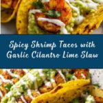 These Spicy Shrimp Tacos with Garlic Cilantro Lime Slaw are a vibrant and flavorful meal perfect for a quick weeknight dinner. Juicy shrimp are seasoned with a smoky chili and cumin spice blend, sautéed to perfection, and served on warm tortillas topped with a creamy, tangy garlic cilantro lime slaw, smashed avocado, and Cotija cheese. The combination of spices, fresh lime, and creamy elements makes each bite irresistibly delicious.