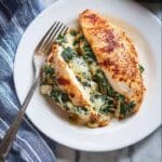 This Spinach Stuffed Chicken Breasts recipe features tender chicken breasts filled with a creamy mixture of cream cheese, Parmesan, spinach, and spices, baked to perfection for a delicious and satisfying meal that’s perfect for weeknight dinners.