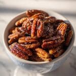 Deliciously sweet and crunchy stovetop maple candied pecans made with pure maple syrup and a hint of cinnamon. Perfect as a snack or topping for salads, desserts, and breakfast bowls.