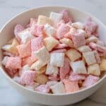 Strawberry Puppy Chow is a delightful, sweet snack mix featuring cinnamon Chex cereal coated in melted white chocolate and strawberry powder, then dusted with powdered sugar and mixed with festive Valentine’s M&M’s and marshmallows. This easy-to-make treat is perfect for quick snacks, parties, or a fun dessert.