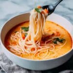 Slowly stir in the creamy coconut milk to the pot. Let the soup simmer for a few more minutes until it thickens slightly and becomes velvety smooth. Finish by stirring in chopped cilantro and fresh lime juice. Finally, add the cooked vermicelli noodles directly into the pot to warm through before seasoning with salt and pepper. These final touches brighten and balance the bold flavors, bringing the Thai Coconut Curry Soup Recipe to a luscious finish.