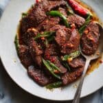 A vibrant and flavorful Thai Hot and Spicy Beef recipe featuring tender slices of beef stir-fried with fragrant red curry paste, kaffir lime leaves, garlic, and fiery chilies. This quick and easy dish is perfect for a spicy meal served with jasmine rice.