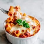 This Three Cheese Baked Ziti Recipe freezes beautifully and is a lifesaver for busy nights. Assemble the dish but skip the final bake, then cover tightly with foil and freeze for up to 3 months. When you’re ready, bake straight from frozen, adding extra baking time to ensure it’s heated through and bubbly.