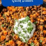 A quick and delicious Turkey Sweet Potato Skillet perfect for a nutritious weeknight dinner. Ground turkey is cooked with sweet potatoes and seasoned with taco spices, then topped with melted cheddar cheese and served with fresh lettuce, Greek yogurt, salsa, and guacamole for a flavorful and balanced meal.