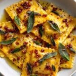 This Vegan Lemon Ricotta Ravioli recipe features a delicate homemade pasta filled with a creamy, tangy tofu-based ricotta substitute. Enhanced with lemon zest, nutritional yeast, and fresh herbs, these tender ravioli are boiled to perfection and served with melted vegan butter and fresh garnishes. Ideal for a flavorful and comforting Italian-inspired main course that is entirely plant-based and dairy-free.