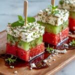 Refreshing and easy-to-make Watermelon Cucumber Feta Skewers, a perfect 10-minute appetizer combining sweet watermelon, crisp cucumber, and tangy feta cheese, finished with a drizzle of balsamic glaze and fresh mint for a vibrant and flavorful bite.