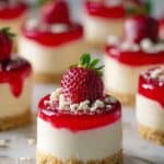 These White Chocolate Strawberry Cheesecake Bites are a delightful no-bake dessert featuring a crunchy graham cracker crust, creamy cheesecake filling, fresh strawberry topping, and a drizzle of melted white chocolate. Perfect for bite-sized indulgence at parties or a sweet treat any time.